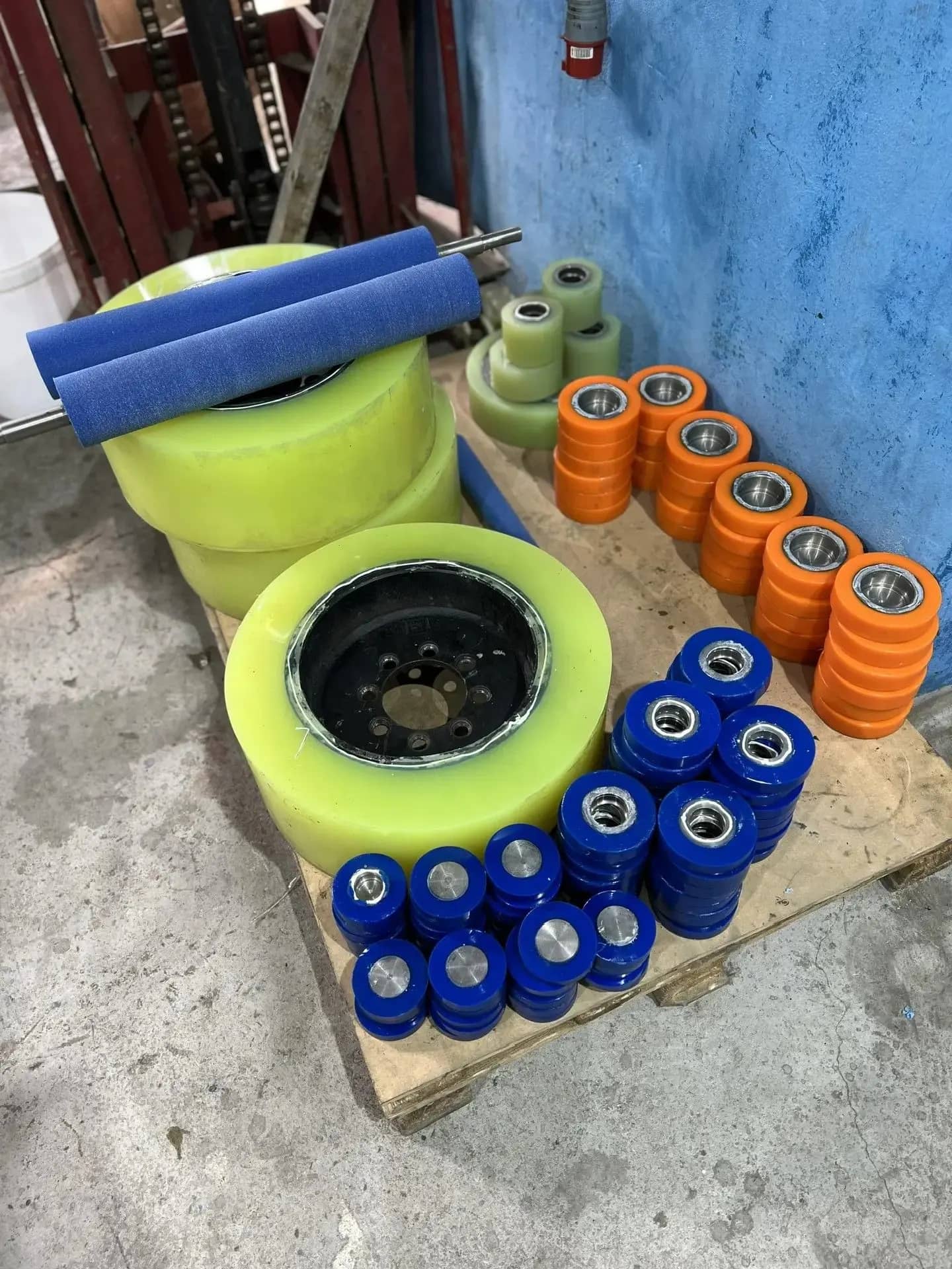 по восстановлению, замене старого покрытия на колёсах, валах и роликах.